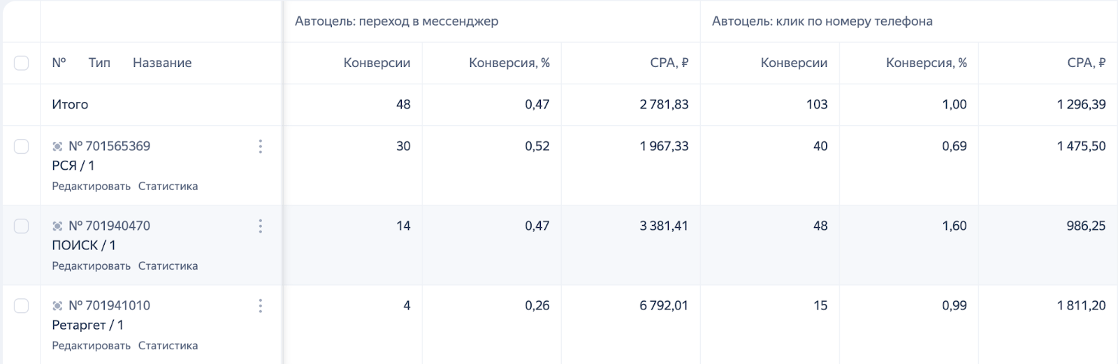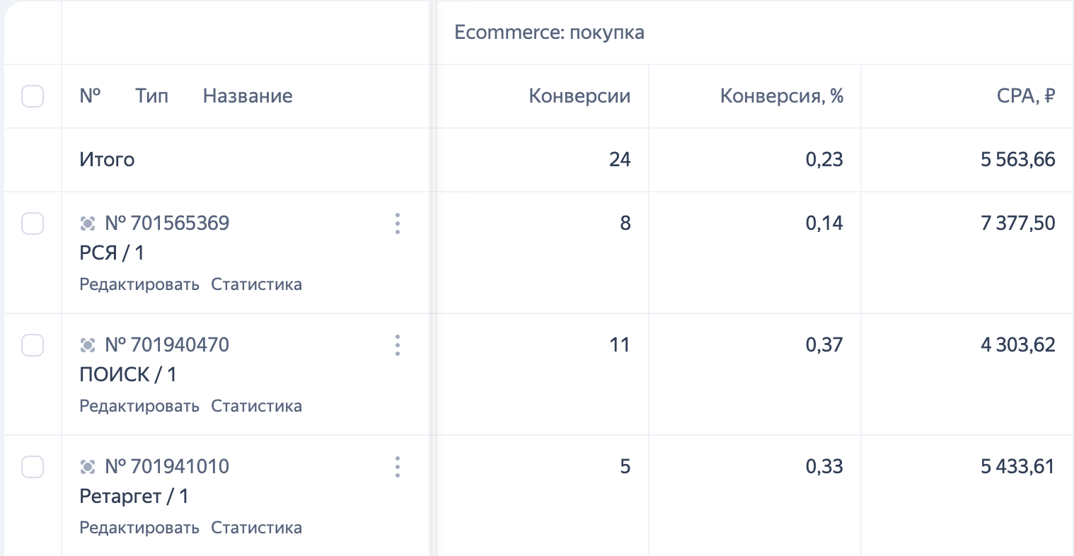 - разделили кампании на Поиск и РСЯ, чтобы избежать пересечения аудиторий и снизить стоимость клика;