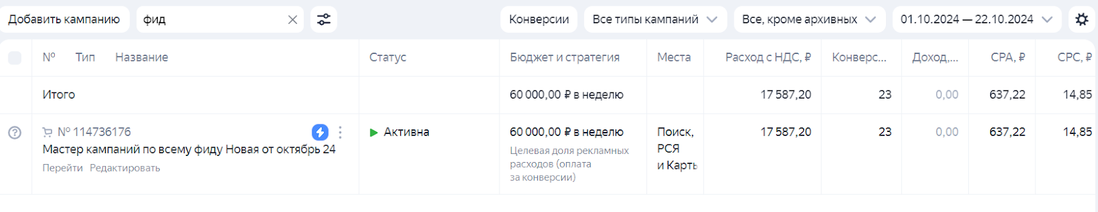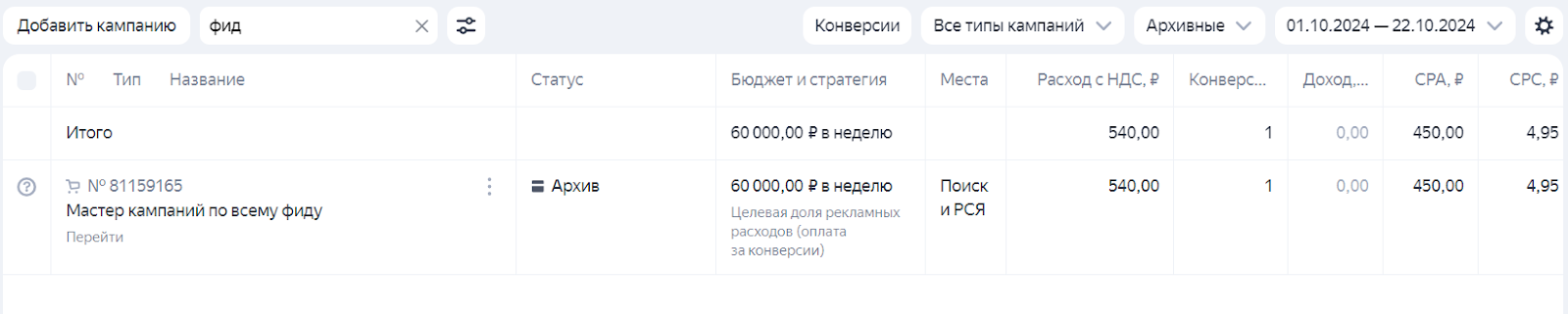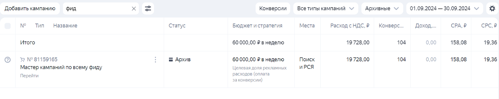 Одной из ключевых была кампания, запущенная через Мастер кампаний по фиду по всем товарам, стабильно приносившая много обращений по выгодной цене почти год.