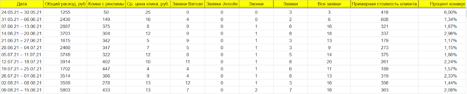 За первые 2 недели получили 17 звонков. Позднее количество началось уменьшаться. В итоге за месяц ведения удалось зафиксировать только 30 обращений. Клиент хотел больше звонков при стоимости коллтрекинга в 5000 рублей в месяц.