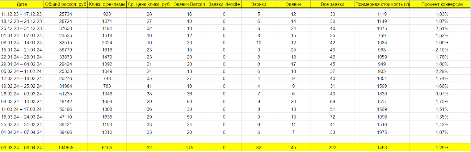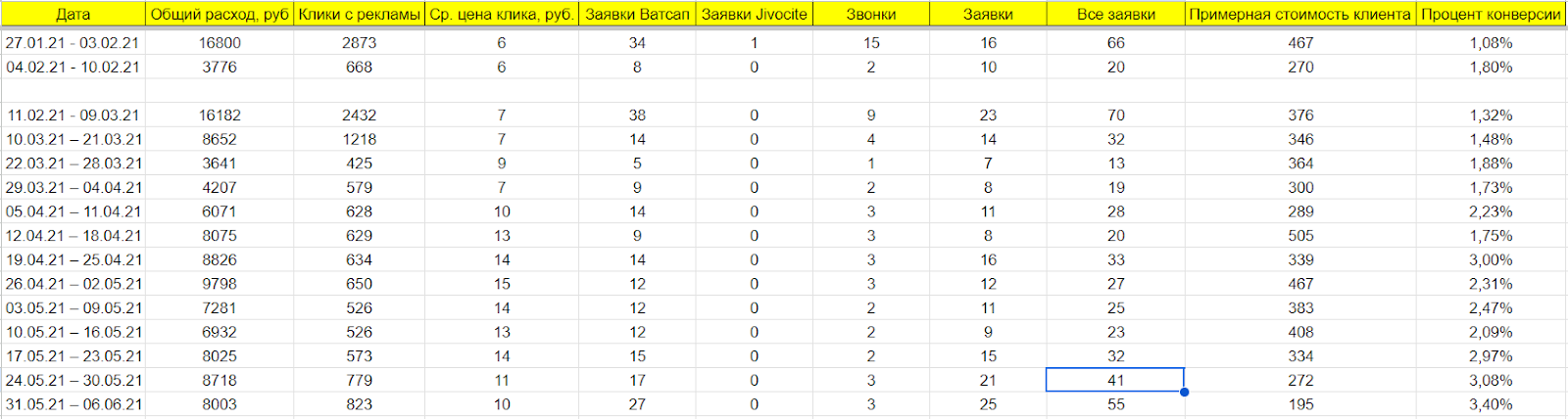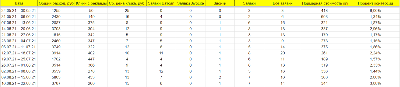 Позже из-за высокой стоимости заявок кампании перевели на стратегию «Оплата за конверсии», при которой деньги списываются только при получении контактных данных через формы на сайте. Однако это значительно снизило количество заявок.