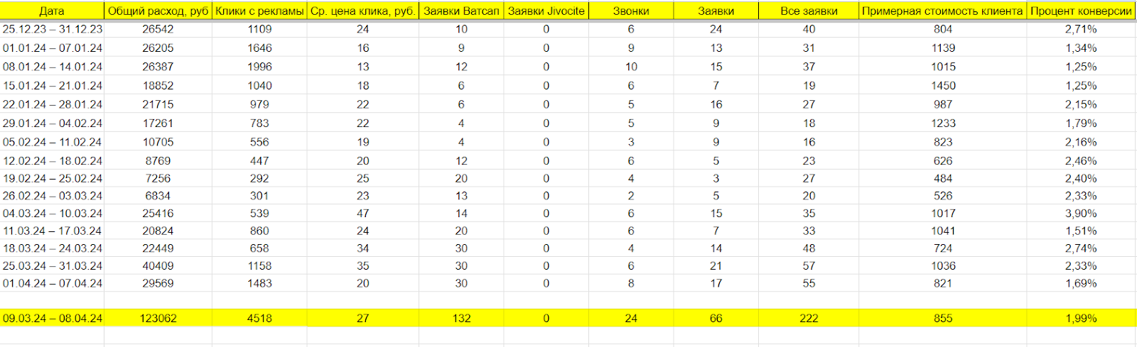 Сначала специалисты сравнили переходы с реальными обращениями. Они сообщали о дате и времени перехода в мессенджер с рекламы, а клиент давал обратную связь. Он сообщал, действительно ли была заявка или звонок с канала примерно в это время. Заявок было немало, поэтому команда договорилась с клиентом учитывать 50% всех переходов в Whatsapp и Telegram. Именно такой процент пользователей переходит в заявку.