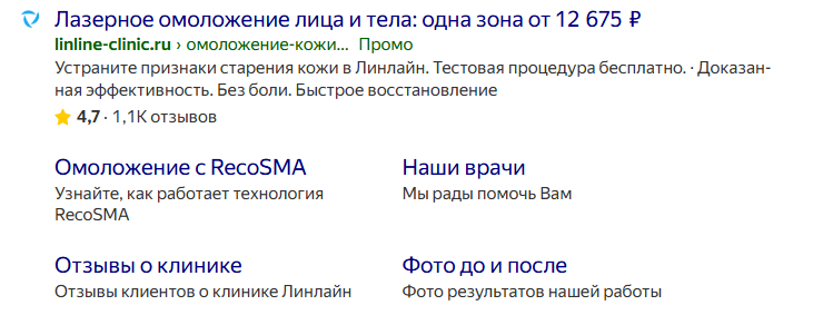 Цифры и конкретные кейсы убеждают лучше слов. Чтобы в объявлении отображались рейтинг и отзывы, привяжите кампанию к подтвержденной карточке в Яндекс Бизнесе. Используйте быстрые ссылки на отзывы, фото работ, информацию о мастерах. Это позволяет любопытным клиентам сразу удовлетворить свой запрос на подтверждение качества. Упоминайте стаж специалистов, наличие сертификатов, конкретные бренды материалов.