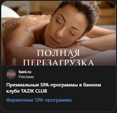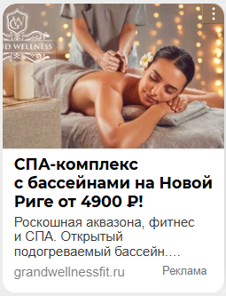 Этот спа-комплекс использует таргетинг на платежеспособную аудиторию, ценящую комплексный отдых. Картинка передает атмосферу премиального заведения. Заголовок четко указывает на локацию и ценовой сегмент («от 4900 рублей»). Текст продает не массаж, а инфраструктуру (аквазона, фитнес, бассейн), позиционируя визит как событие для полноценного досуга.
