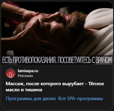 Не пытайтесь вместить в один креатив все услуги и преимущества. Одно объявление продает глубокое расслабление, другое — идеальный подарок, третье — решение конкретной боли. Такая фокусировка делает сообщение сильнее.