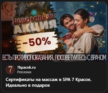 Это хороший сезонный креатив. Изображение дарения сертификата в праздничной обстановке визуализирует идею подарка, снимая с покупателя муки выбора. Текст лишь подтверждает эту мысль — «Идеально в подарок». Объявление решает не проблему красоты, а проблему поиска хорошего презента.