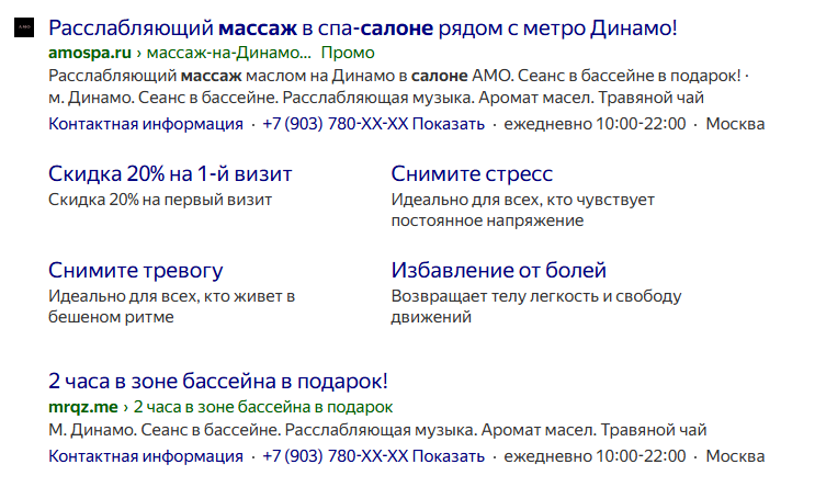 - Заголовок сразу создает образ легкости и близости: «расслабляющий массаж», «рядом с метро».