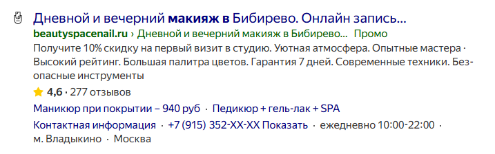 - Заголовок предельно конкретен: услуга, район («в Бибирево»), действие («Онлайн запись»). Он рассчитан на человека, который уже ищет «рядом с домом».