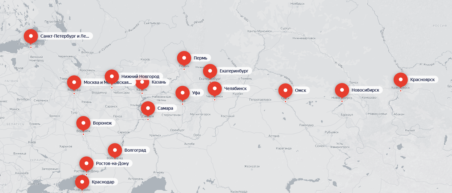 Первое, что вы увидите — карта России с отмеченными на ней городами, по которым доступна статистика.