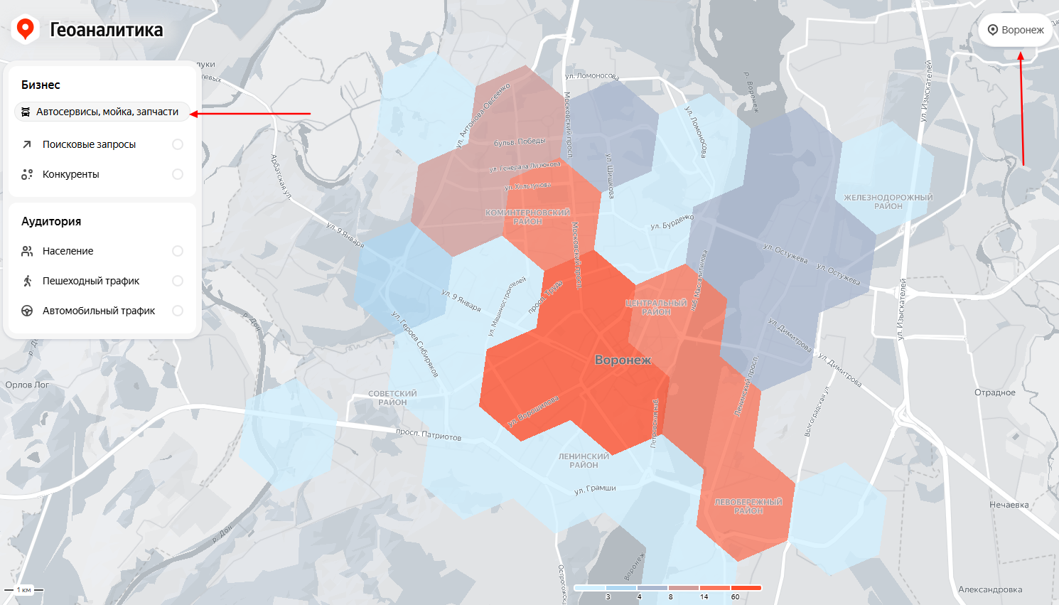 Чем ярче цвет — тем насыщеннее ситуация в этой локации (охват, конкуренция, трафик, заинтересованность). Данные доступны для 16 крупных российских городов в 32 нишах бизнеса.