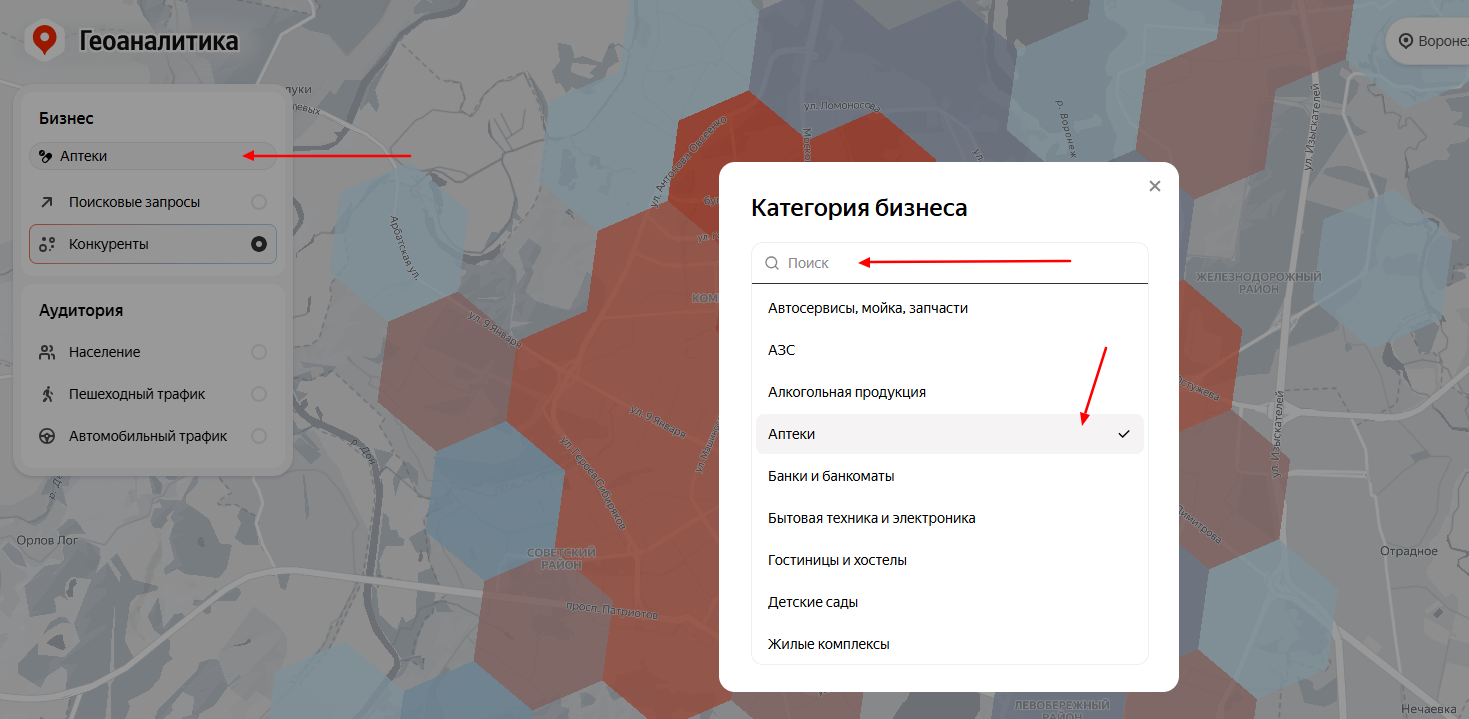 Шаг 2. Выбираем нишу. По умолчанию на карте представлены данные по тематике «Автосервисы, мойка, запчасти» (первая по алфавиту). Но нас интересуют, например, аптеки, поэтому в выпадающем списке выбираем эту тематику.
