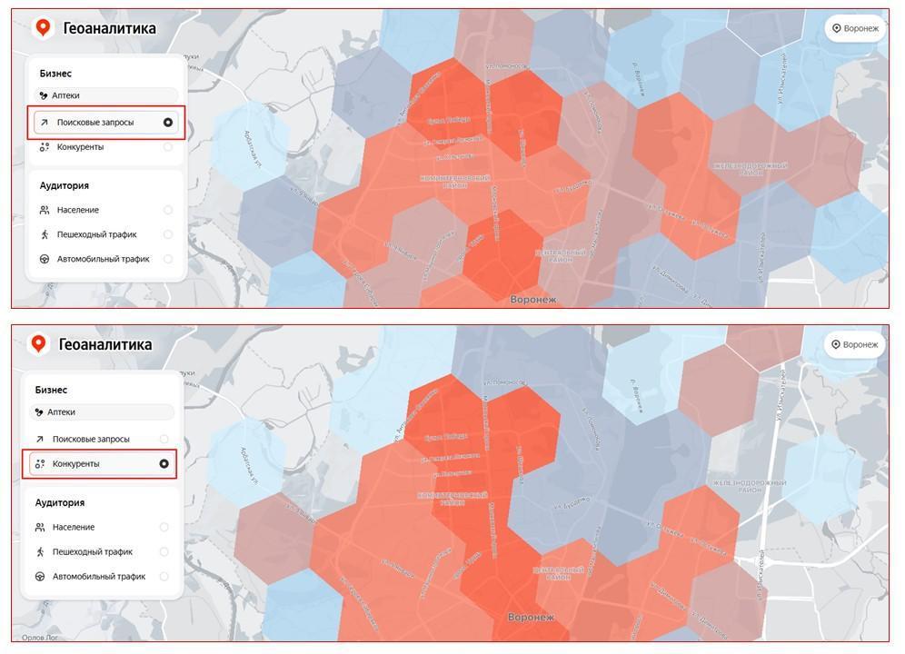 Шаг 3. Смотрим данные по поисковым запросам и присутствию конкурентов. Чем ярче шестиугольник — тем чаще в этой локации пользователи ищут аптеки (если оцениваем запросы) или тем больше там аптек (если оцениваем конкурентов).