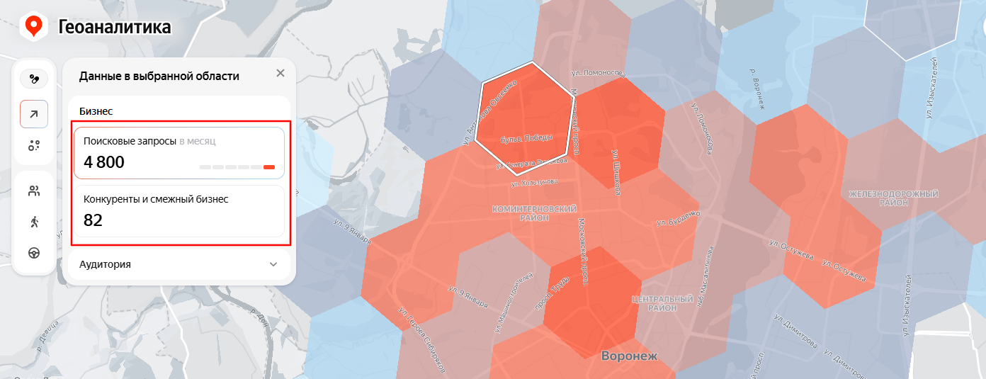 Геоаналитика — это на вид привычная нам Яндекс Карта, но разбитая на шестиугольники разного цвета.