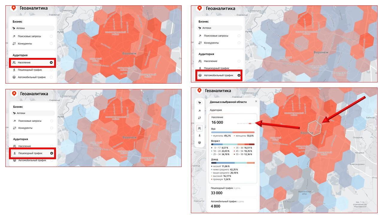 Шаг 4. Оцениваем данные по аудитории и трафику (пешеходный, автомобильный). Выбираем интересующую нас метрику — получаем общую картину по ней. Далее смотрим детализацию по локации (аналогично шагу 3).