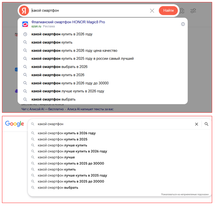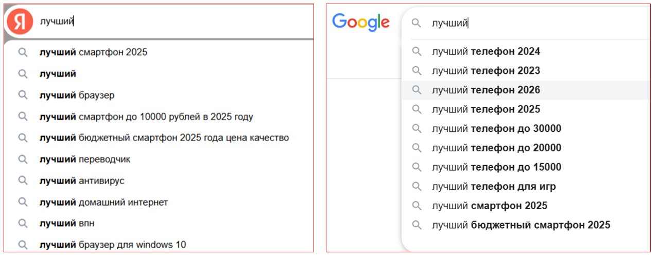 Подсказки в поисковой строке Яндекса или Google — это фразы, которые появляются в виде списка автозаполнения, как только пользователь начинает вводить искомую фразу.