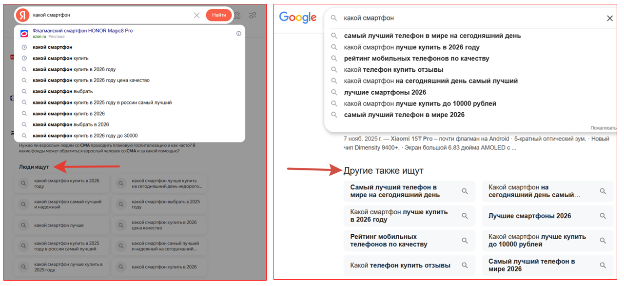 Подсказки в поисковой строке позволяют увидеть реальные формулировки запросов пользователей и учитывать их при формировании семантического ядра для рекламы или поискового продвижения. Фразы из подсказок значительно расширяют и дополняют базовую семантику (в том числе, LSI-фразами), позволяют поймать горячий и сезонный трафик.