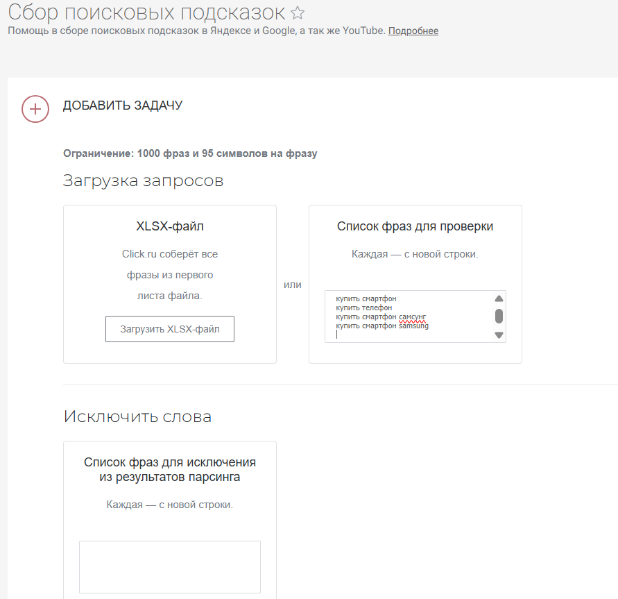 - Инструмент для сбора поисковых подсказок от click.ru. Собирает поисковые подсказки из Яндекса, Google и YouTube. Есть возможность загрузить исходные ключевые фразы списком или с помощью XLSX-файла. Доступно облачное хранение отчетов с постоянным доступом. Парсинг происходит в фоновом режиме. Глубина парсинга до трех уровней. Бесплатный парсинг 50 запросов для тестирования работы инструмента.