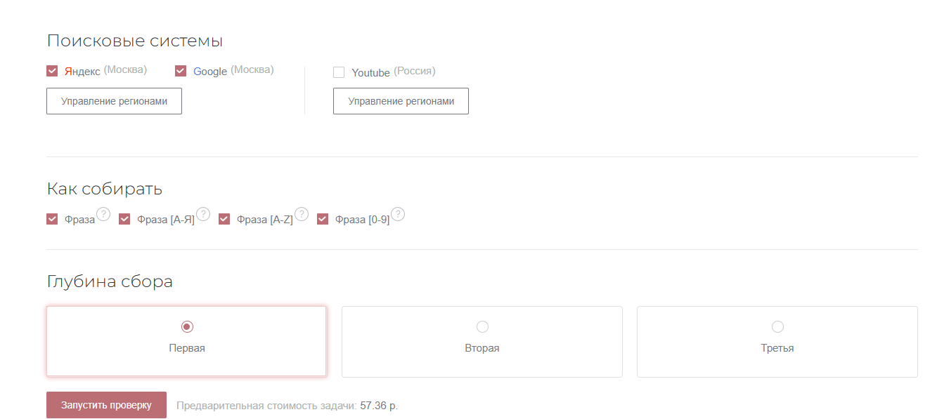 - Rush Analytics. Гибкие настройки перебора алфавитов и глубины парсинга. Алгоритм удаления вариантов без трафика. Первые 7 дней бесплатно, далее — от 500 руб.