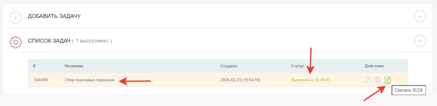 Шаг 6. В блоке «Список задач» видим процесс проверки. Проверку в статусе «Готово» можно выгрузить в xls-файл.