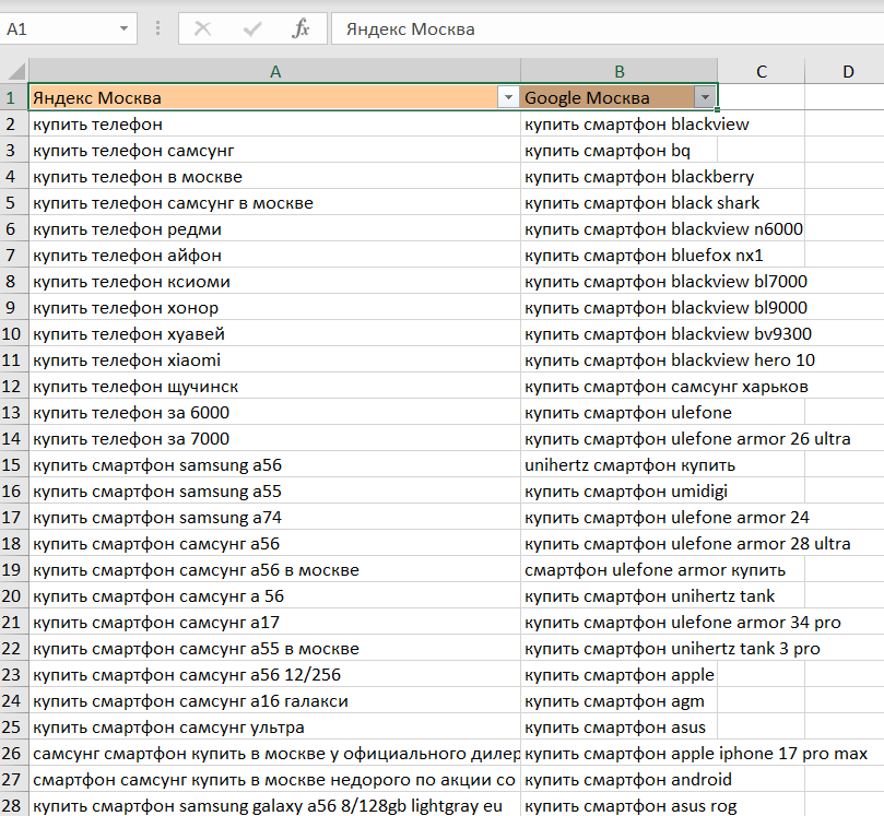 Частая ошибка при сборе подсказок — начинать со слишком общих высокочастотных запросов, которые тянут за собой море мусора и утяжеляют последующую работу по очистке данных. Например, запрос «смартфон» соберет тысячи нерелевантных вариантов. Лучше использовать более узкие фразы, например, «купить смартфон samsung».
