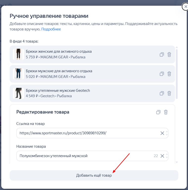 Есть ограничение — нельзя добавить более 1000 товаров. По итогу вы получите товарный фид, который появится в интерфейсе и будет доступен для редактирования, но не для скачивания. При использовании этой опции на логине формируется один файл на все кампании.