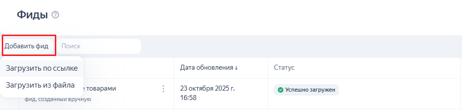 1. На странице «Управление фидами». Добавляем готовый фид ссылкой или файлом;