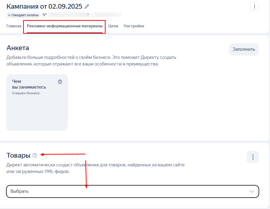 2. На странице создания объявления (ЕПК) или кампании (Мастер кампаний).