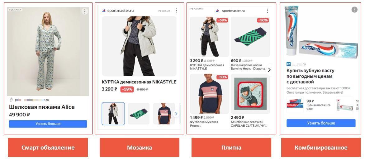 1. В Рекламной сети Яндекса (смарт-баннеры). Здесь система сама подбирает подходящий формат показа для конкретной площадки и конкретного пользователя. Это может быть обычное объявление, мозаика, плитка или комбинированный формат. В идеале использовать параллельно и товарные объявления, и каталожные — только тогда система сможет показать ваш товар в комбинированном формате.
