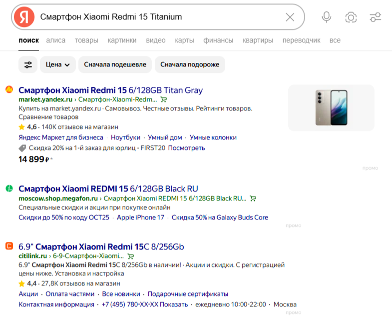 2. В поисковой выдаче (динамические объявления). Внешне они ничем не отличаются от текстово-графических, и предположить, что перед нами товарное объявление, можно лишь по довольно подробному заголовку. Директ взял точное название товара из файла и сформировал объявление конкретно под тот товар, который ищет пользователь.