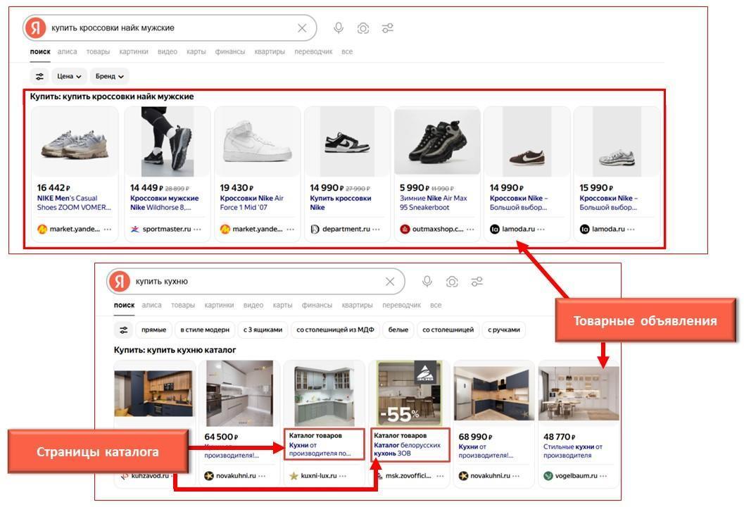 3. В Товарной галерее. Хороший вариант для показа товара «лицом» — здесь он отображается с картинкой и на максимально заметной позиции. В этом блоке легко отличить товарное объявление от каталожного: на вторых есть метка «Каталог товаров».