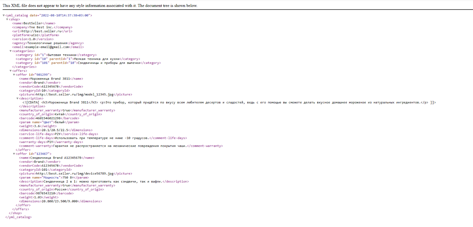 Его структура основана на элементах, которые в порядке иерархии вложены один в другой. То есть в элемент магазин (<shop>) вкладываются категории товаров (<categories>), а в каждую категорию вкладываются отдельные товары (<offer>), в каждый из которых вложены элементы с описанием.