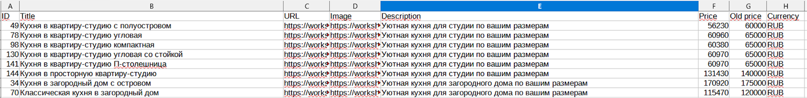 Суть формирования файла такая же, как и для товаров, но элементы немного другие: Url, Title, Description, Offer minimal price, Currency, Image url — Image url 5 (пять ссылок на картинки). Есть ограничение по количеству полей — до 1000.