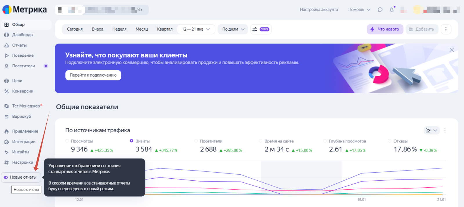 Если ваш интерфейс по какой-то причине автоматически не сменился на новый, переключатель на этой кнопке поможет перейти в обновленную Яндекс Метрику. Также, если вы не хотите видеть новое отображение и желаете продолжать работать в старом — с помощью переключателя сможете вернуться в привычный интерфейс. Но мы не рекомендуем этого делать. В скором времени старое отображение перестанет работать, и сейчас самое время привыкать пользоваться новыми отчетами.