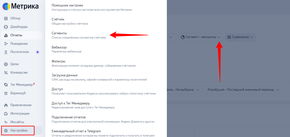 Управлять созданными сегментами можно по-старому: либо выбираем их в отчете, либо просматриваем в «Настройках», раздел «Сегменты».