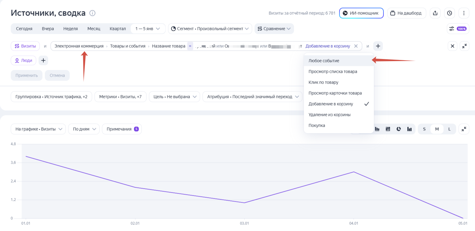 В отчетах Яндекс Метрики, построенных на массивах данных, например по электронной коммерции, можно выбрать, на каком уровне сегментировать данные: по всему визиту, по конкретному событию или по указанному параметру внутри массива. Уровень выбирается с помощью опции, которая появляется в конце строки с настраиваемым сегментом.