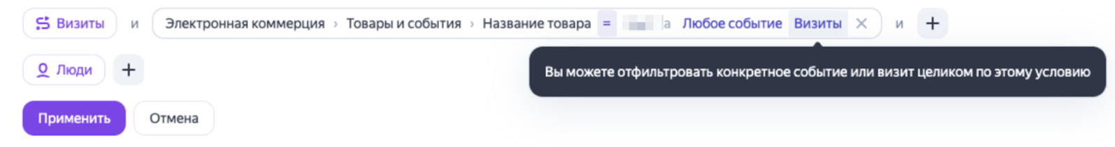 Кнопки фильтрации ранее назывались «Визиты в которых» и «Для людей у которых». Они остались на прежнем месте, но сменили названия, соответственно, на «Визиты» и «Люди». Набор метрик для фильтрации не изменился.