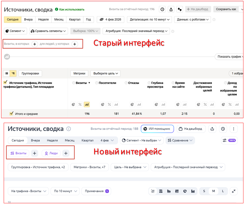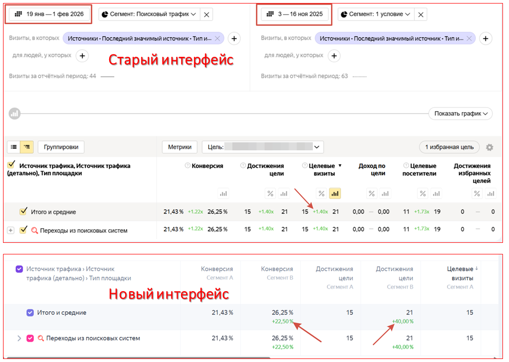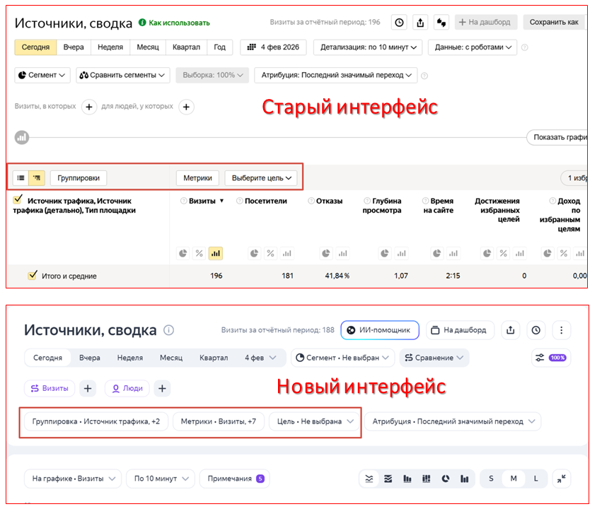 Основные обновления коснулись навигации в отчетах. Опции «Группировки», «Метрики» и «Цели» изменили свое расположение. На скриншоте — сравнение старого и нового отчетов. Ранее эти кнопки размещались под графиком, теперь переместились выше него.