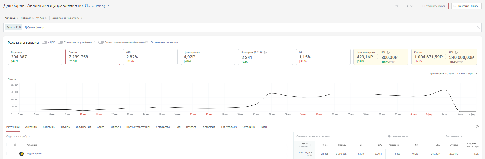 Удобнее всего работать с аналитическими данными на дашбордах — отчетах, где ключевые показатели собраны в одном окне. Специально для маркетологов и руководителей, которые управляют рекламными кампаниями, click.ru разработал инструмент «Дашборды. Аналитика и управление». С его помощью можно посмотреть статистику по Яндекс Директу, ВКонтакте и альтернативным площадкам. Инструмент бесплатен для пользователей click.ru — попробуйте и оцените скорость и удобство работы со статистикой.