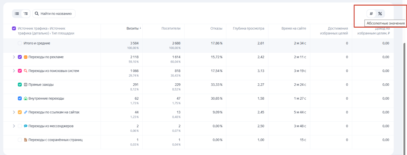 Еще одна новая опция — переключатель значений в таблице с абсолютных величин на относительные. В таблице все равно остаются оба значения, но выбранное занимает первое, более заметное, место.