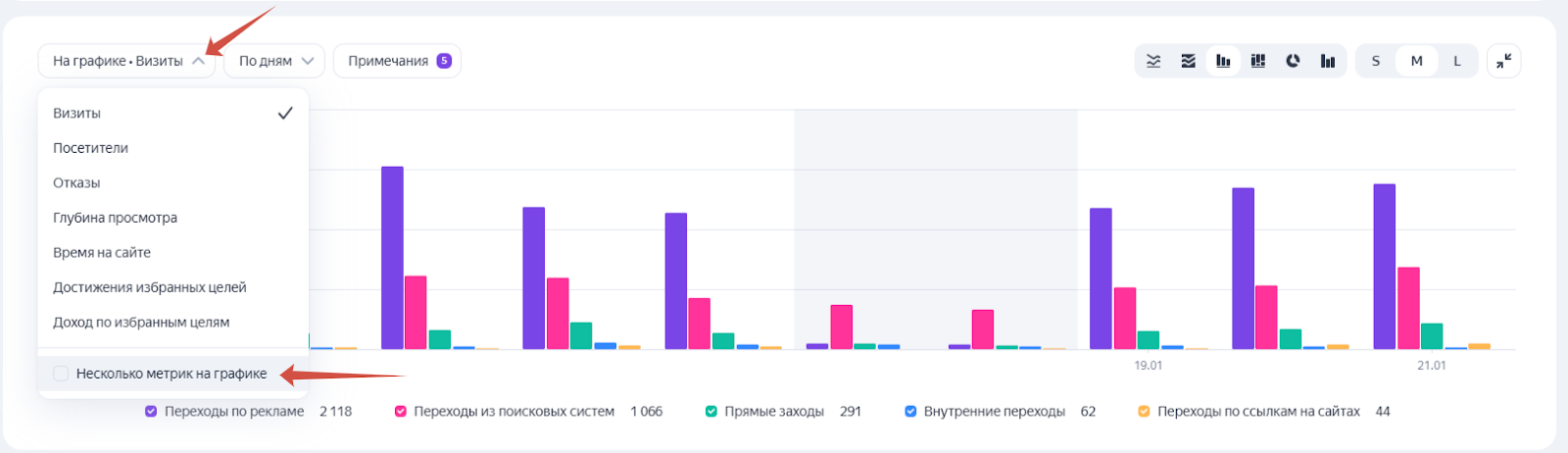 Теперь это не только визиты, но и посетители, отказы, конверсии, доход. Причем некоторые метрики можно увидеть одновременно и наглядно отследить их зависимость друг от друга.