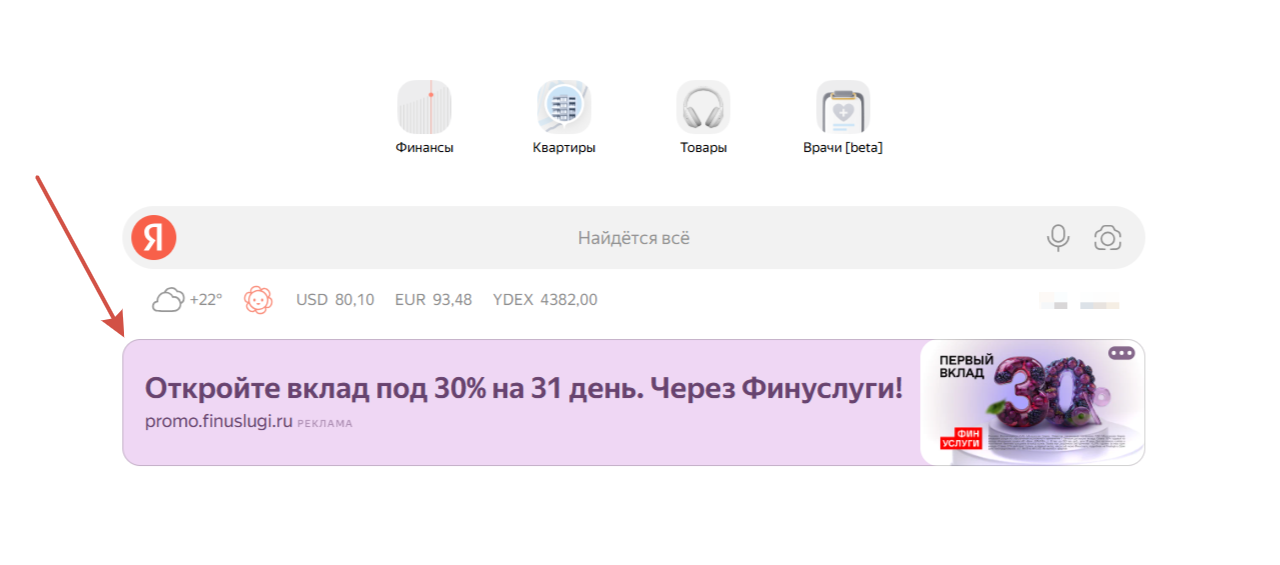 5. Баннер под поисковой строкой. Заметный формат баннера на Поиске. Показывается не по ключевым словам, из таргетингов в этом типе размещения только регион показа.