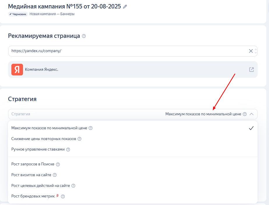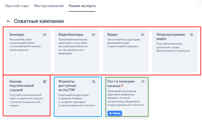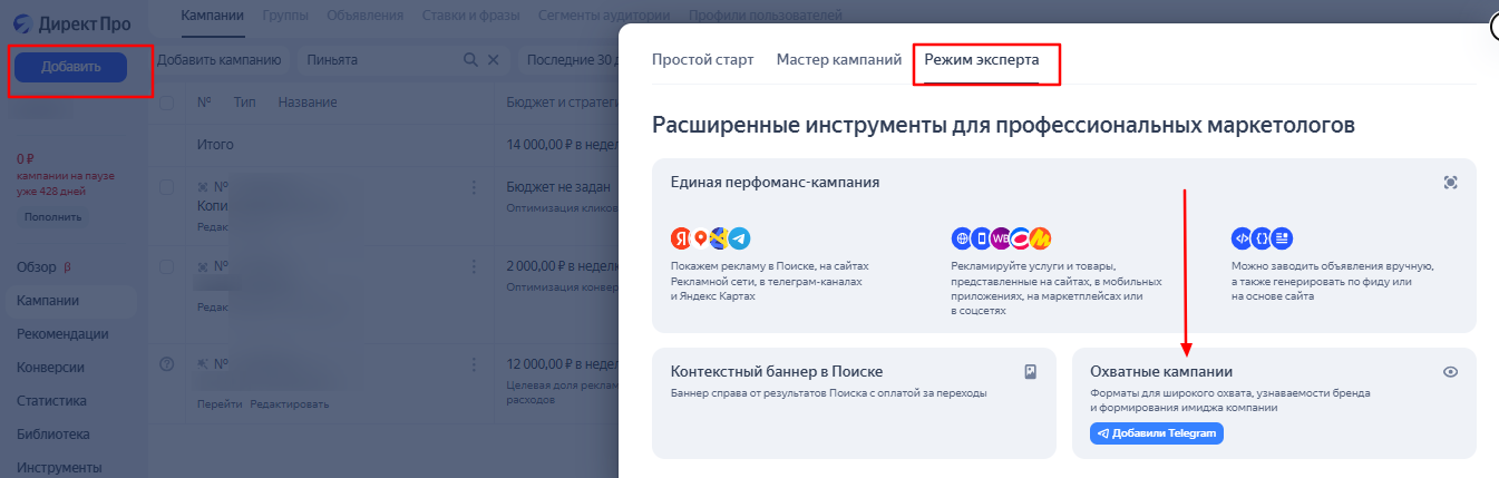 Настройка охватной кампании доступна только в интерфейсе Директ Про (в базовом такой возможности нет). Рассмотрим пошагово все этапы создания на примере баннерной рекламы.