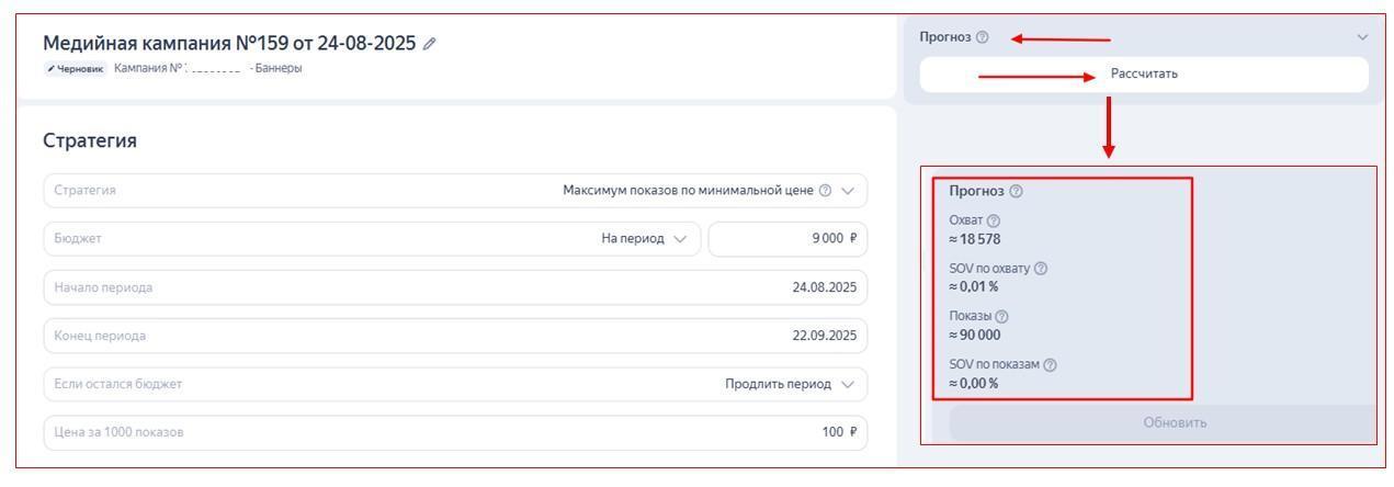 Шаг 3. Рассчитайте прогноз. С его помощью можно как посчитать охват рекламной кампании, так и прикинуть количество показов, а также долю охваченных пользователей.