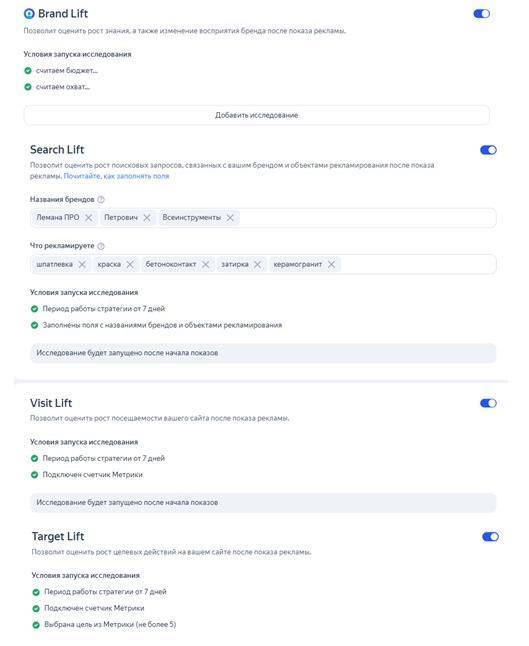 Шаг 6. Запустите исследования. Все они бесплатны, и помогут многое узнать об эффективности имиджевого продвижения. Исследования Brand Lift, Search Lift, Visit Lift, Target Lift запускаются, чтобы проверить, как медийка повлияла на дальнейшее поведение пользователей, которые ее увидели. Они доступны только при выполнении рекламодателем условий по бюджету, наличию счетчика Метрики, периоду размещения.