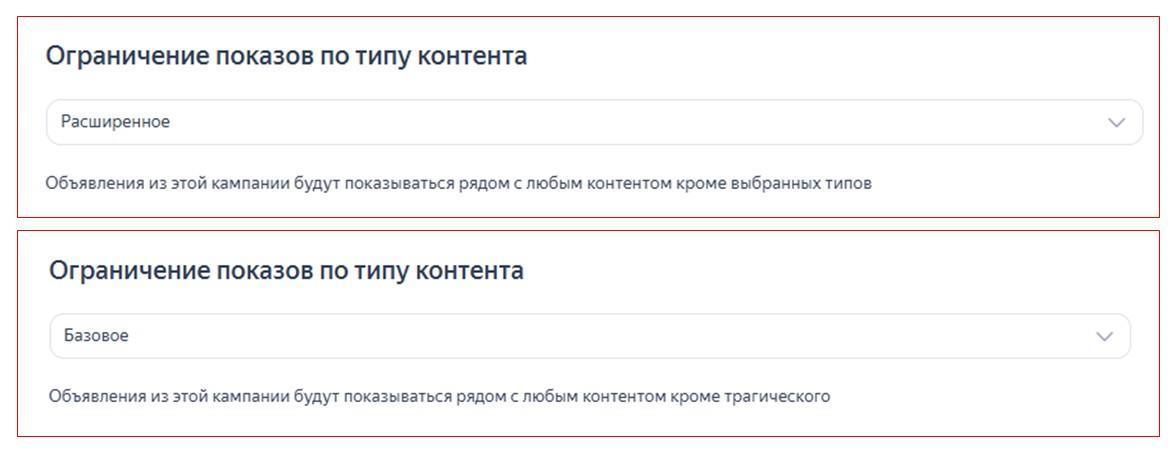 Шаг 7. Настройте ограничение показов по типу контента: базовое (не будет показов рядом с трагическим контентом) или расширенное (не будет показов рядом с азартными играми, информацией о терроризме и оружии, негативными новостями, нецензурной лексикой, взрослым контентом). Здесь работает технология Brand Safety: крупному бренду не пойдет на пользу соседство с таким контентом (пользователи могут посчитать это неуместным и неприятным).
