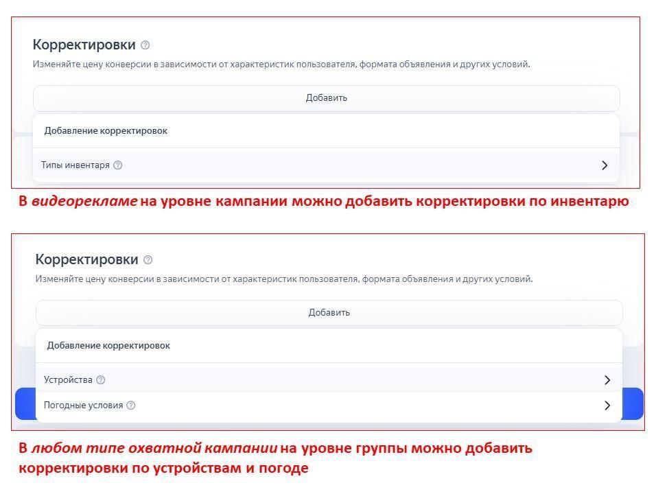 - добавляем корректировки ставок по погоде или устройству. Корректировка по устройствам знакома нам по ЕПК. Что касается погоды, то действуем по принципу: в морозы повышаем ставку для баннеров с рекламой угги, а в дождь повышаем ставку на зонты и ветровки.