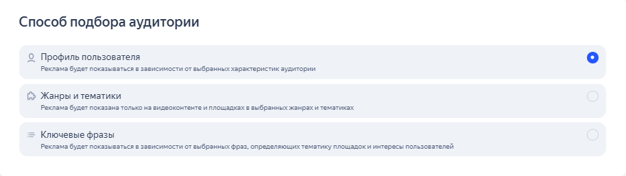 - настраиваем способ подбора аудитории: профиль пользователя, жанры и тематики или ключевые слова. В одной группе можно выбрать только одно из условий, сменить его после сохранения не получится. Для видеорекламы ключевые слова недоступны, они используются только для баннеров и видеобаннеров;
