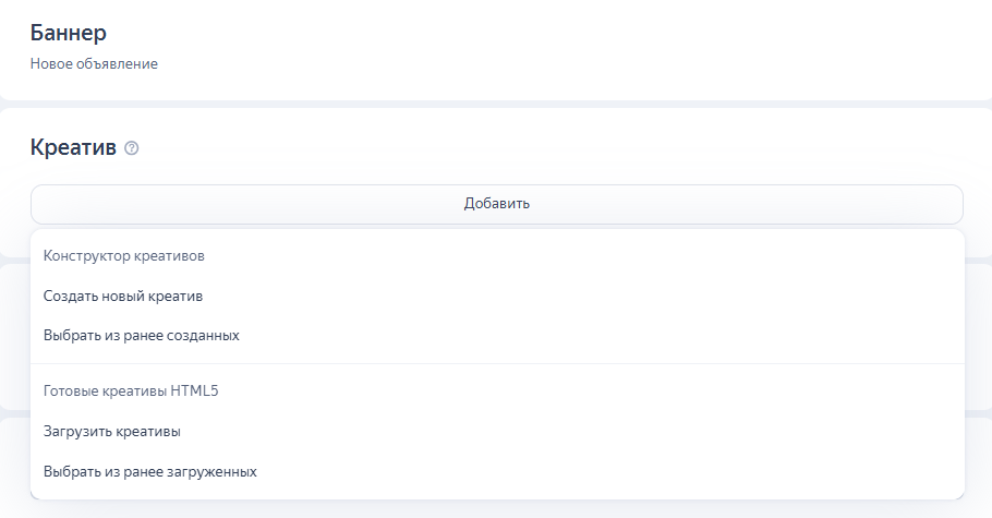 Шаг 10. Создаем креатив. Здесь два варианта на выбор — создать баннер в конструкторе либо загрузить свой.