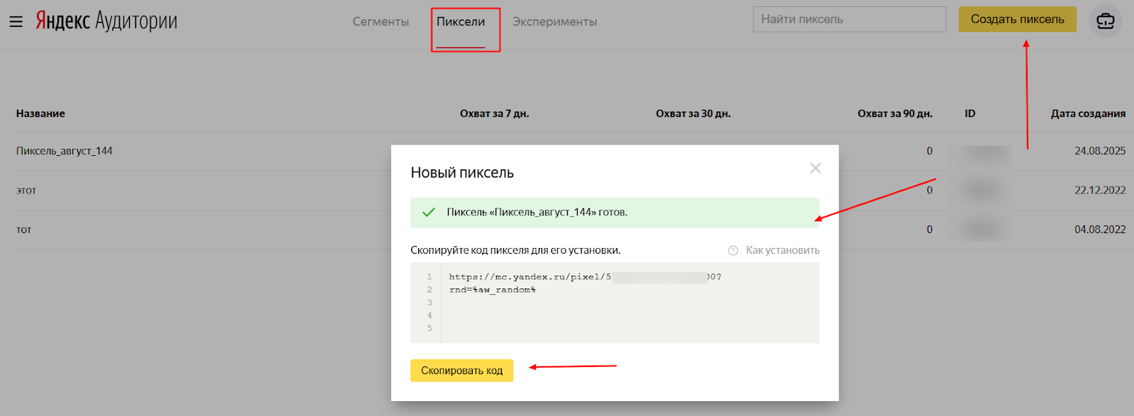 1. Пиксель создается в сервисе Яндекс Аудитории и добавляется к баннеру в Директе, чтобы в него собирались анонимные идентификаторы пользователей, видевших этот баннер. Такой пиксель пригодится позже, чтобы запускать на этих пользователей ретаргетинговую перфоманс-рекламу;
