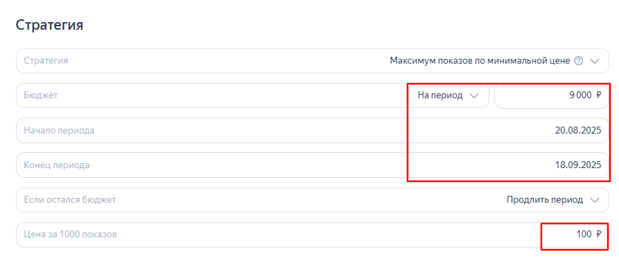 Шаг 2. Выбираем стратегию. Каждая из них уже преднастроена, вам остается только скорректировать период, бюджет и CPM.