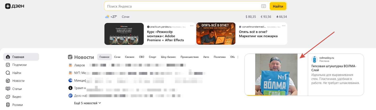 По сути, медийка появляется на тех же площадках, что и текстово-графические объявления с картинками или видео из Мастера кампаний или Единой перфоманс-кампании. Единственное исключение — баннер под поисковой строкой, который мы видим в Поиске: хотя это и сетевые показы «под капотом», но настроить его можно только через охватную кампанию отдельного типа.